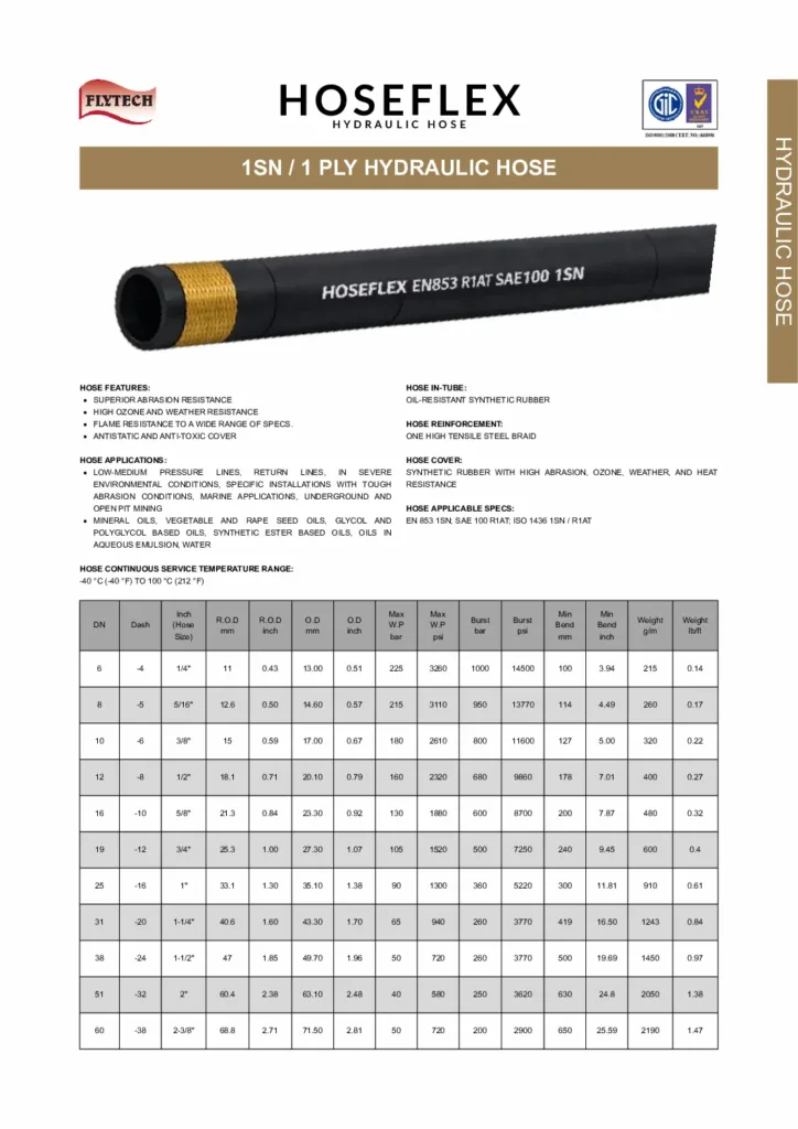 The EN853 1SN Hydraulic Hose is a high-quality, medium-pressure hydraulic hose designed for industrial and mobile hydraulic applications. Built with one layer of high-tensile steel wire braid, it offers excellent flexibility, easy installation, and reliable performance under continuous pressure.