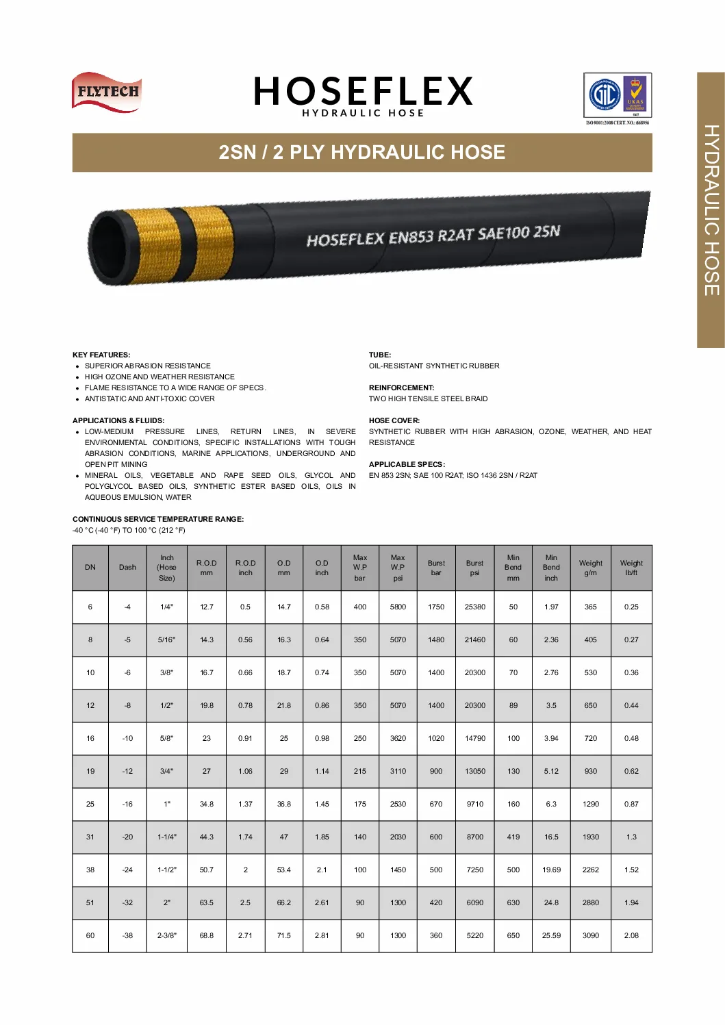 The EN853 2SN Hydraulic Hose is a premium high-pressure hydraulic hose engineered with two layers of high-tensile steel wire braid for superior strength and durability. Designed for heavy-duty machinery, industrial hydraulics, and mobile equipment, this hose delivers reliable performance at higher working pressures than 1SN.